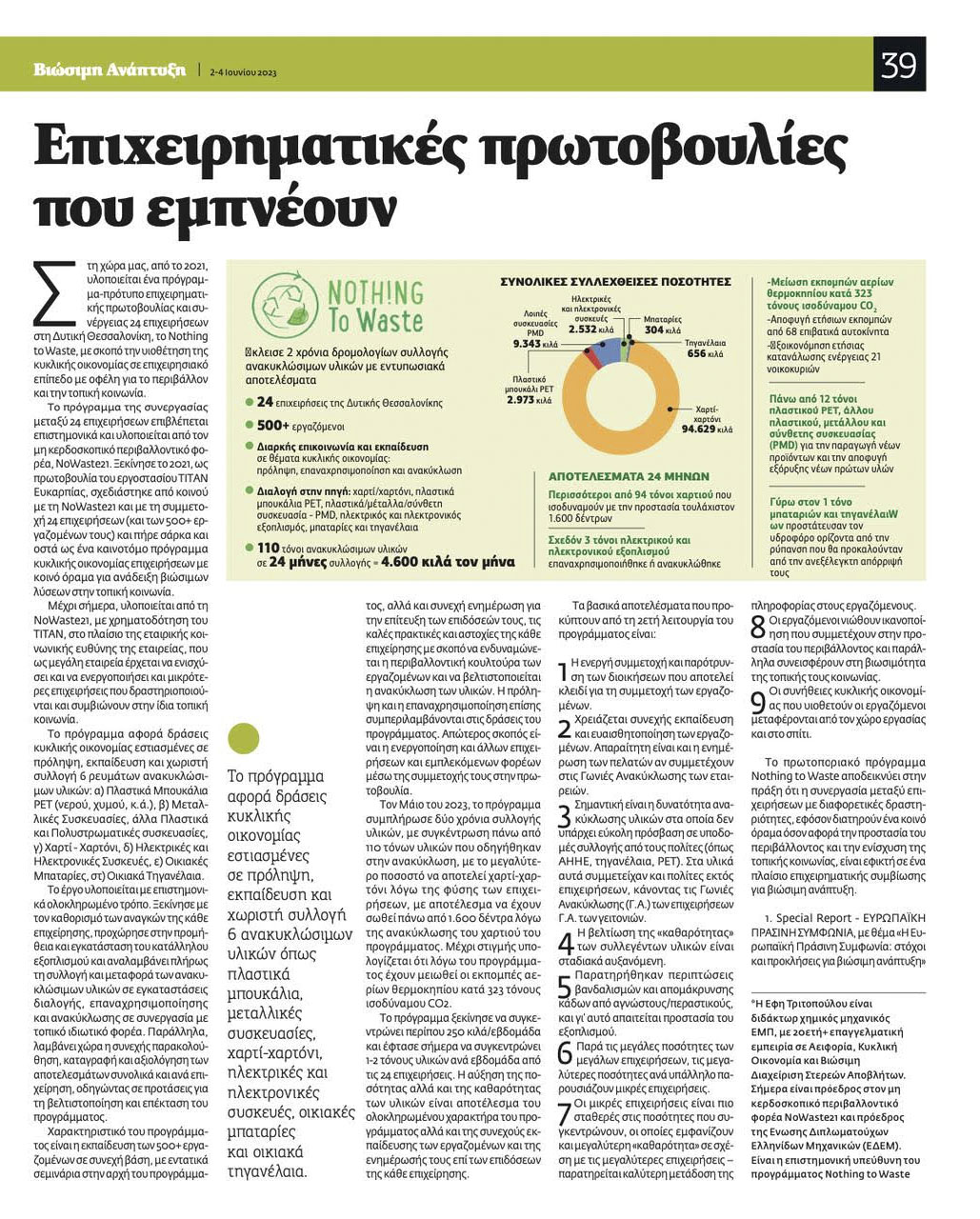 Το έργο Nothing to waste παρουσιάστηκε ως καλή πρακτική συνέργειας 24 επιχειρήσεων, στο πλαίσιο άρθρου που επιμελήθηκε η Πρόεδρος της Nowaste21 Δρ. Εφη Τριτοπούλου με τίτλο ''Βιώσιμη επιχειρηματικότητα και συνεργατικότητα'' και δημοσιεύθηκε στην ειδική έκδοση της Εφημερίδας των Συντακτών (ΕΦΣΥΝ) με αφιέρωμα στην Βιώσιμη Ανάπτυξη (2-4/6/23).