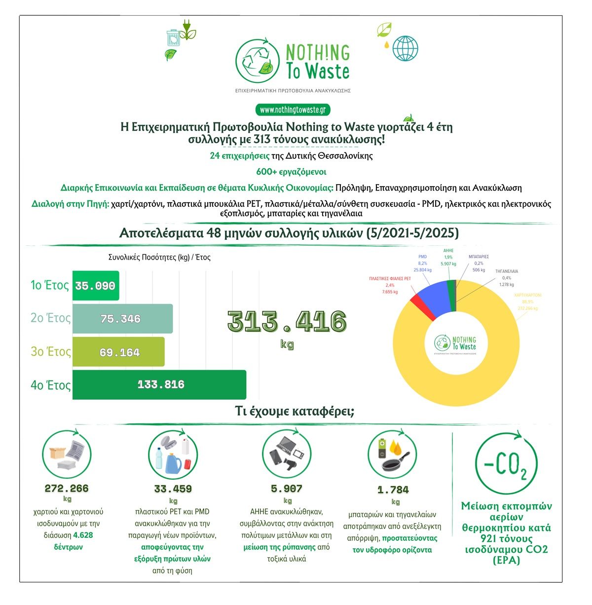 Η επιχειρηματική πρωτοβουλία κυκλικής οικονομίας Nothing to Waste, ξεκίνησε την συλλογή ανακυκλώσιμων υλικών τον Μάιο του 2021, παράλληλα με εκπαιδευτικές δράσεις στην κυκλική οικονομία, και κλείνει φέτος τέσσερα χρόνια δράσης, έχοντας συλλέξει 313,4 τόνους ανακυκλώσιμων υλικών.